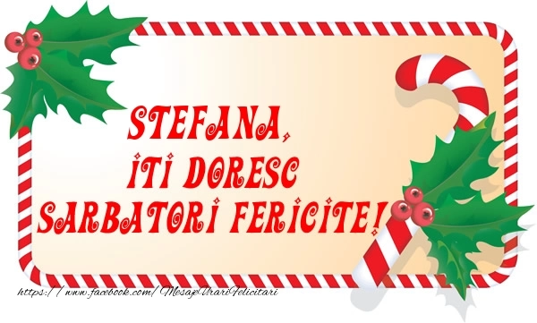 Această felicitare cu aranjament de sarbatori din colecția noastră de felicitari de Craciun cu numele Stefana are o notă de originalitate și îți oferă ocazia să faci o persoană să se simtă specială datorită faptului că acolo este numele ei. Felicitarea se poate descărca gratuit sau se poate trimite prin Whatsapp, Facebook, Twitter, Pinterest. Imagine de Sărbătoarea Crăciunului cu aranjament de sarbatori cu dimensiunile 600px x 361px și cu textul Stefana Iti Doresc Sarbatori Fericite!.