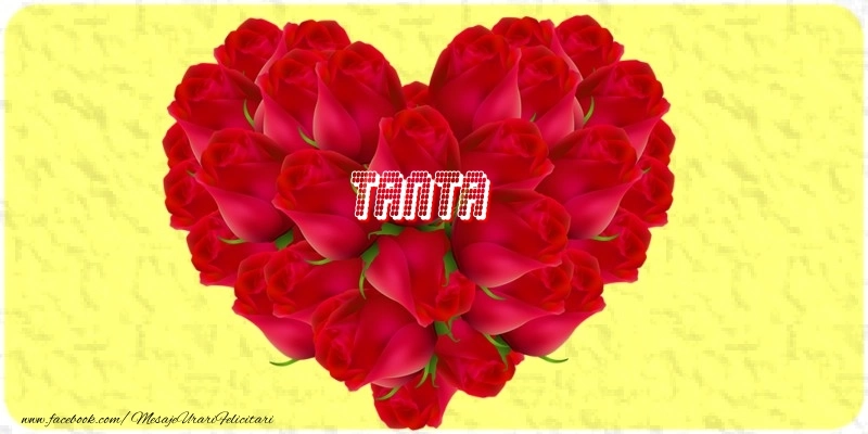 Această felicitare cu inimă din trandafiri roșii din colecția noastră de felicitari de dragoste cu numele Tanta are o notă de originalitate și îți oferă ocazia să faci o persoană să se simtă specială datorită faptului că acolo este numele ei. Felicitarea se poate descărca gratuit sau se poate trimite prin Whatsapp, Facebook, Twitter, Pinterest. Imagine de iubire cu inimă din trandafiri roșii cu dimensiunile 800px x 400px și cu textul Tanta.