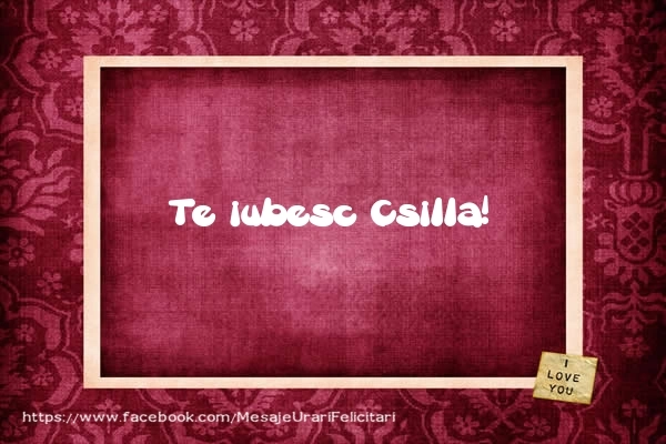 Această felicitare cu I LOVE YOU din colecția noastră de felicitari de dragoste cu numele Csilla are o notă de originalitate și îți oferă ocazia să faci o persoană să se simtă specială datorită faptului că acolo este numele ei. Felicitarea se poate descărca gratuit sau se poate trimite prin Whatsapp, Facebook, Twitter, Pinterest. Imagine de iubire cu I LOVE YOU cu dimensiunile 600px x 400px și cu textul Te iubesc Csilla!.
