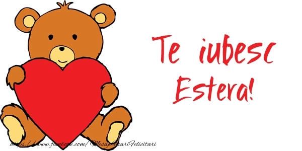 Această felicitare cu ursuleț cu o inimă roșie din colecția noastră de felicitari de dragoste cu numele Estera are o notă de originalitate și îți oferă ocazia să faci o persoană să se simtă specială datorită faptului că acolo este numele ei. Felicitarea se poate descărca gratuit sau se poate trimite prin Whatsapp, Facebook, Twitter, Pinterest. Imagine de iubire cu ursuleț cu o inimă roșie cu dimensiunile 600px x 300px și cu textul Te iubesc Estera!.