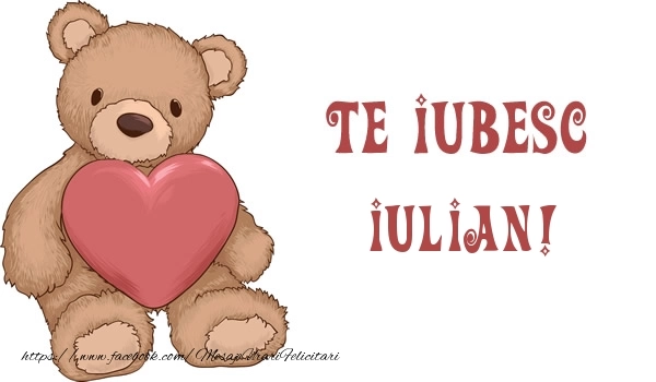 Această felicitare cu ursuleț cu inimioră din colecția noastră de felicitari de dragoste cu numele Iulian are o notă de originalitate și îți oferă ocazia să faci o persoană să se simtă specială datorită faptului că acolo este numele ei. Felicitarea se poate descărca gratuit sau se poate trimite prin Whatsapp, Facebook, Twitter, Pinterest. Imagine de iubire cu ursuleț cu inimioră cu dimensiunile 600px x 350px și cu textul Iulian, Te iubesc .