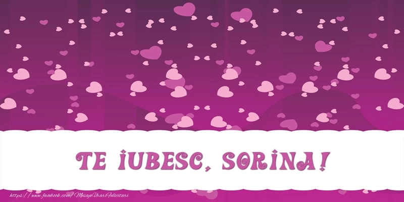 Această felicitare cu inimioare pe fundal mov din colecția noastră de felicitari de dragoste cu numele Sorina are o notă de originalitate și îți oferă ocazia să faci o persoană să se simtă specială datorită faptului că acolo este numele ei. Felicitarea se poate descărca gratuit sau se poate trimite prin Whatsapp, Facebook, Twitter, Pinterest. Imagine de iubire cu inimioare pe fundal mov cu dimensiunile 800px x 400px și cu textul Te iubesc, Sorina!.