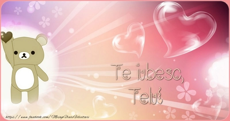 Această felicitare cu inimioare și floricele din colecția noastră de felicitari de dragoste cu numele Telu are o notă de originalitate și îți oferă ocazia să faci o persoană să se simtă specială datorită faptului că acolo este numele ei. Felicitarea se poate descărca gratuit sau se poate trimite prin Whatsapp, Facebook, Twitter, Pinterest. Imagine de iubire cu inimioare și floricele cu dimensiunile 800px x 420px și cu textul Te iubesc, Telu!.