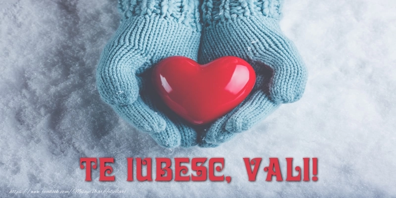 Această felicitare cu inimioară in zapada in palmele unei persoane din colecția noastră de felicitari de dragoste cu numele Vali are o notă de originalitate și îți oferă ocazia să faci o persoană să se simtă specială datorită faptului că acolo este numele ei. Felicitarea se poate descărca gratuit sau se poate trimite prin Whatsapp, Facebook, Twitter, Pinterest. Imagine de iubire cu inimioară in zapada in palmele unei persoane cu dimensiunile 800px x 400px și cu textul TE IUBESC, Vali!.