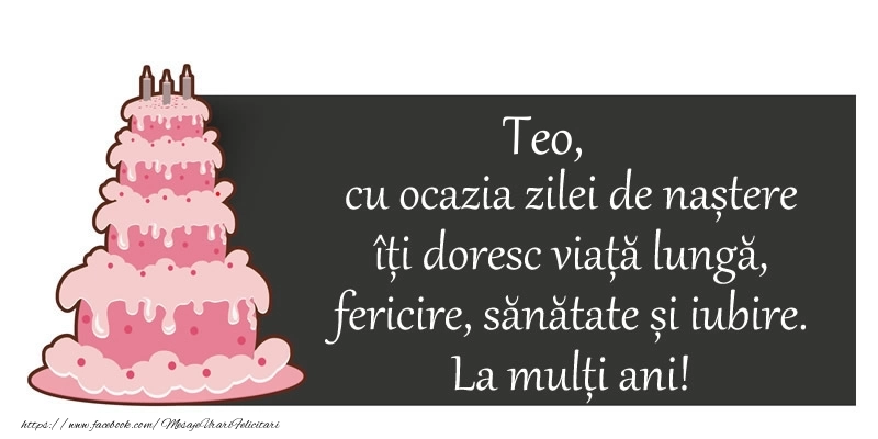 Sărbătorește ziua cuiva drag cu această felicitare cu numele Teo, ce îmbină frumusețea unui tort festiv cu un mesaj dulce de La Mulți Ani. Această felicitare aduce în prim plan emoția și bucuria unei astfel de sărbători, gata să transmită cele mai sincere urări de fericire și împlinire. Felicitarea se poate descărca gratuit sau se poate trimite prin Whatsapp, Facebook, Twitter, Pinterest. Imaginea are dimensiunile 800px x 400px și textul Teo, cu ocazia zilei de nastere iti doresc viata lunga, fericire, sanatate si iubire. La multi ani!.