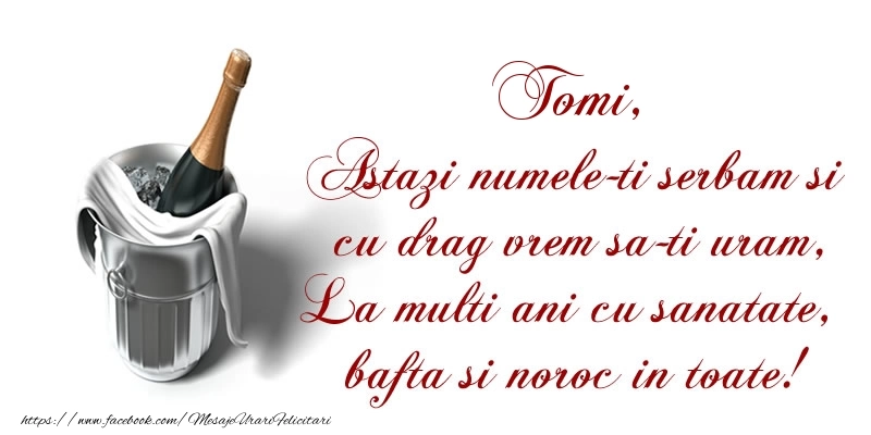 Tomi Astazi numele-ti serbam si cu drag vrem sa-ti uram, La multi ani cu sanatate, bafta si noroc in toate. | Felicitare cu poezie cu sampanie în frapiera | Felicitari de Ziua Numelui