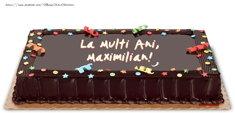 Această felicitare cu tort de ciocolată cu confeti din colecția noastră de felicitari de zi de nastere cu numele Maximilian are o notă de originalitate și îți oferă ocazia să faci o persoană să se simtă specială datorită faptului că acolo este numele ei. Felicitarea se poate descărca gratuit sau se poate trimite prin Whatsapp, Facebook, Twitter, Pinterest. Imagine de zi de nastere cu tort de ciocolată cu confeti cu dimensiunile 805px x 390px și cu textul La multi ani Maximilian!.
