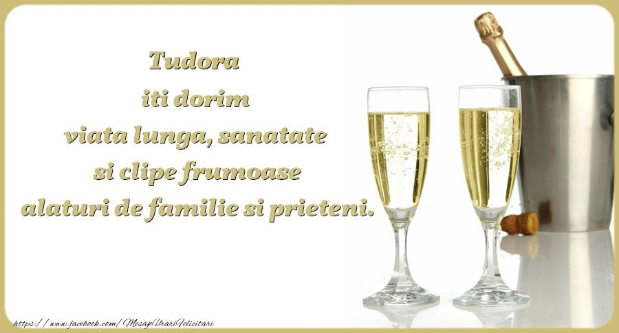 Fie că sărbătorești în intimitate sau într-o petrecere mare, acestă felicitare cu șampanie în frapieră cu pahare pe fundal alb va adăuga un strop de lux și stil în ziua sărbătoritului sau sărbătoritei. Felicitarea se poate descărca gratuit sau se poate trimite prin Whatsapp, Facebook, Twitter, Pinterest. Imaginea cu șampanie în frapieră cu pahare pe fundal alb are dimensiunile 900px x 485px și textul Tudora iti dorim viata lunga, sanatate si clipe frumoase alaturi de familie si prieteni. Cu drag .