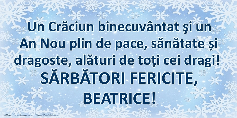Un Crăciun binecuvântat şi un An Nou plin de pace, sănătate și dragoste, alături de toți cei dragi! SĂRBĂTORI FERICITE, Beatrice! | Felicitare cu fulgi de zăpadă | Felicitari de Craciun