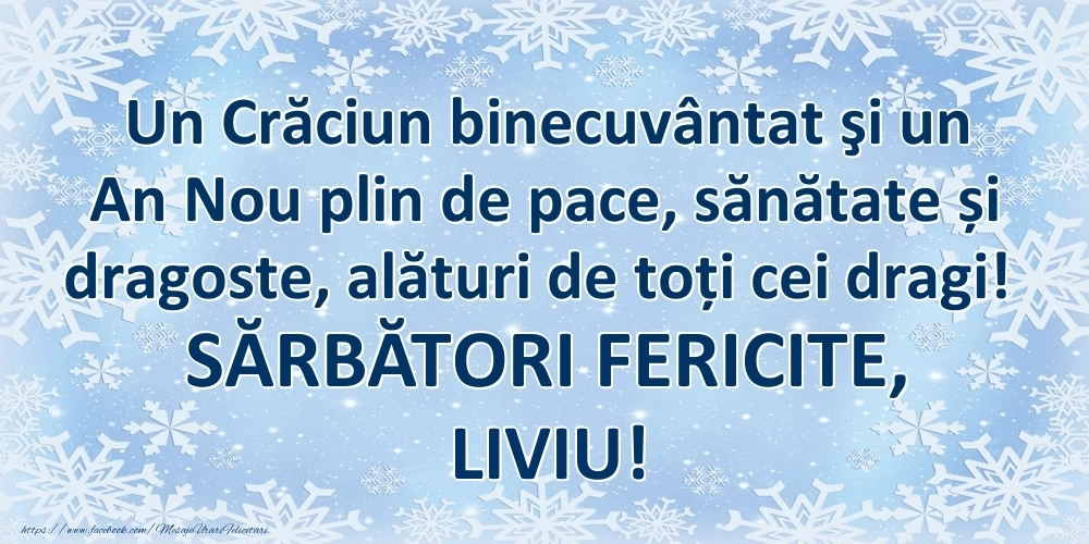 Pentru Liviu Sarbatorile Craciunului si Anului Nou sa va aduca tot ce-i mai bun pe lume, multa iubire, fericire si prosperitate.