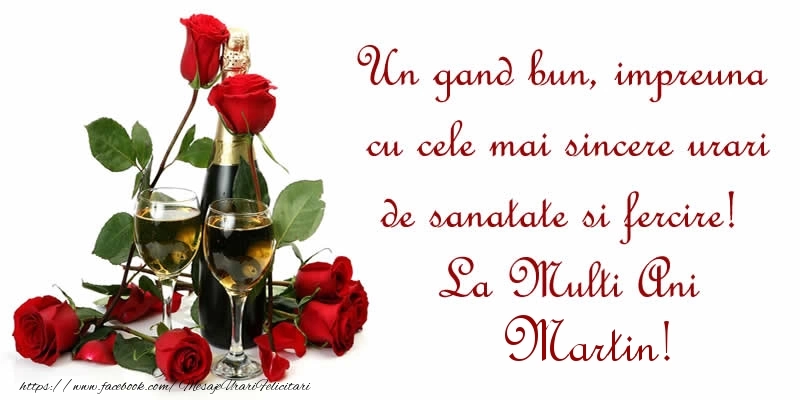 Un gand bun, impreuna cu cele mai sincere urari de sanatate si fercire! La Multi Ani Martin! | Felicitare cu un aranjament cu trandafiri și șampanie | Felicitari de zi de nastere