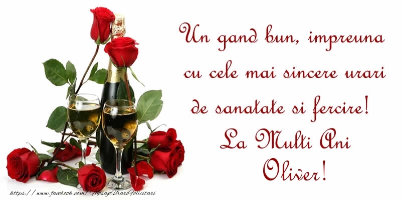 Un gand bun, impreuna cu cele mai sincere urari de sanatate si fercire! La Multi Ani Oliver! | Felicitare cu un aranjament cu trandafiri și șampanie | Felicitari de zi de nastere