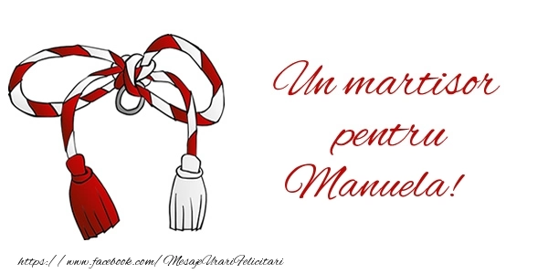 Această felicitare cu șnur alb-roșu din colecția noastră de felicitari de Martisor cu numele Manuela are o notă de originalitate și îți oferă ocazia să faci o persoană să se simtă specială datorită faptului că acolo este numele ei. Felicitarea se poate descărca gratuit sau se poate trimite prin Whatsapp, Facebook, Twitter, Pinterest. Imagine de 1 Martie cu șnur alb-roșu cu dimensiunile 600px x 300px și cu textul Un martisor pentru Manuela!.