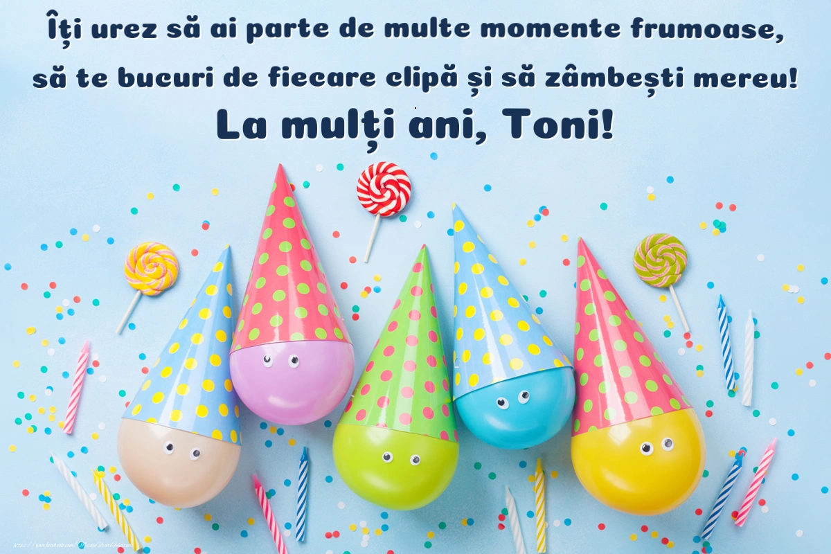 Felicitari de la multi ani | Un mesaj frumos pentru Toni pe o imagine cu emoticoane haiose