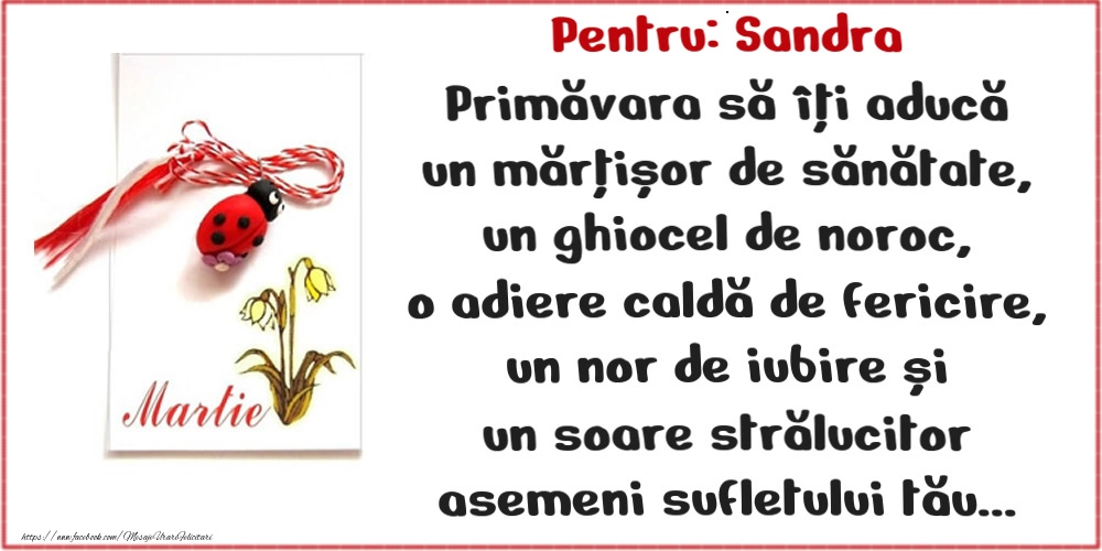 Transformă Mărțișorul într-o experiență personală! Această felicitare de 1 Martie cu un mărțișor clasic cu buburuză și ghiocei este gândită și creată cu atenție, iar numele Sandra se îmbină armonios în designul primăvăratic. O urare cu adevărat specială pentru o persoană unică.