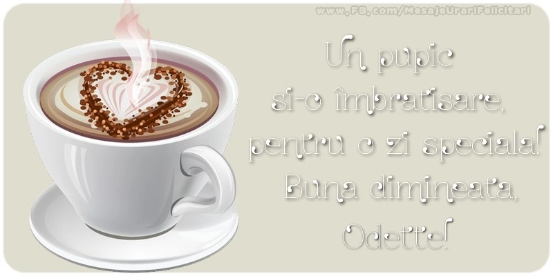 Felicitarea de buna dimineata cu cafea cu inimioară și un pupic pentru Odette aduce cu sine raze luminoase și culori calde, ca o invitație la un nou început plin de bucurie. În această dimineață, aroma cafelei se amestecă cu numele Odette pentru a crea un amestec unic de energie și confort.