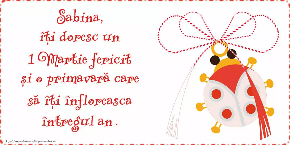 Această felicitare cu un mărțișor buburuză pe fundal alb cu bordură din colecția noastră de felicitari de Martisor cu numele Sabina are o notă de originalitate și îți oferă ocazia să faci o persoană să se simtă specială datorită faptului că acolo este numele ei.