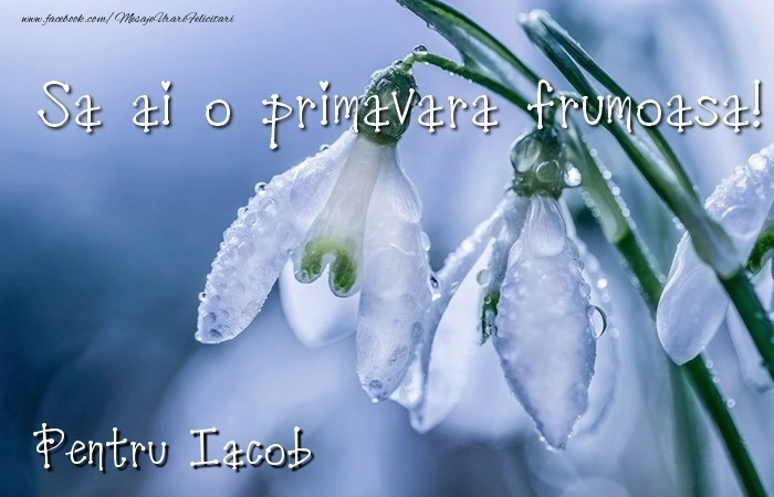 Această felicitare cu ghiocei pentru o colegă din colecția noastră de felicitari de Martisor cu numele Iacob are o notă de originalitate și îți oferă ocazia să faci o persoană să se simtă specială datorită faptului că acolo este numele ei. Felicitarea se poate descărca gratuit sau se poate trimite prin Whatsapp, Facebook, Twitter, Pinterest. Imagine de 1 Martie cu ghiocei pentru o colegă cu dimensiunile 700px x 450px și cu textul Va doresc o primavara minunata Iacob.