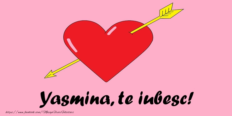 Această felicitare cu inima cu sageata din colecția noastră de felicitari de dragoste cu numele Yasmina are o notă de originalitate și îți oferă ocazia să faci o persoană să se simtă specială datorită faptului că acolo este numele ei. Felicitarea se poate descărca gratuit sau se poate trimite prin Whatsapp, Facebook, Twitter, Pinterest. Imagine de iubire cu inima cu sageata cu dimensiunile 800px x 400px și cu textul Yasmina, te iubesc!.