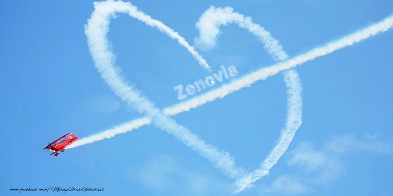 Această felicitare cu inimă facută de un avion din colecția noastră de felicitari de dragoste cu numele Zenovia are o notă de originalitate și îți oferă ocazia să faci o persoană să se simtă specială datorită faptului că acolo este numele ei. Felicitarea se poate descărca gratuit sau se poate trimite prin Whatsapp, Facebook, Twitter, Pinterest. Imagine de iubire cu inimă facută de un avion cu dimensiunile 800px x 400px și cu textul Zenovia.