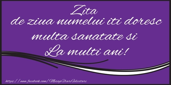 Felicitarea cu mesaj pe fundal mov de Ziua Numelui este un cadou gândit special pentru sărbătoare numelui Zita. Numele Zita devine piesa centrală a acestui dar unic, aducând sărbătoriților un strop de bucurie în aceată zi specială.